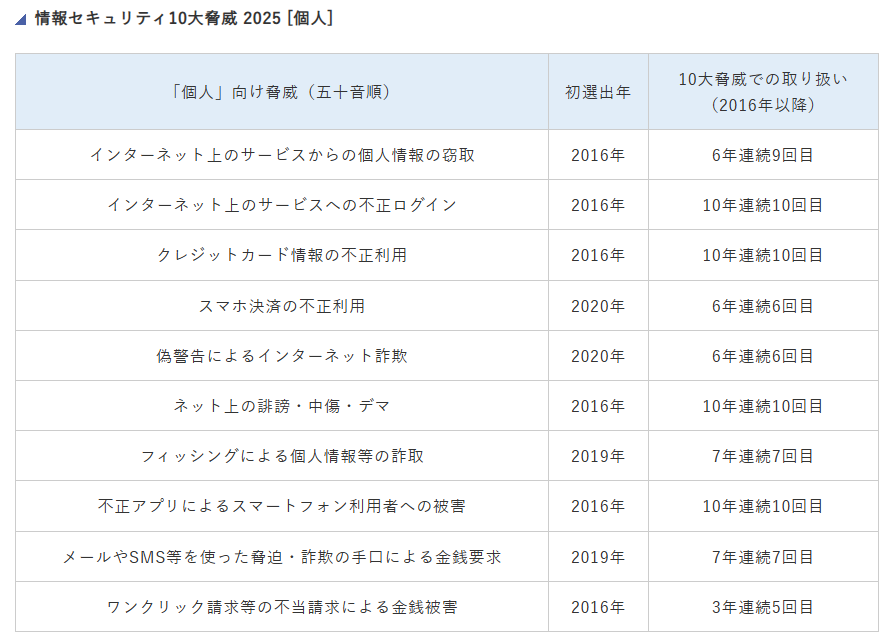 引用元:独立行政法人情報処理推進機構「情報セキュリティ10大脅威2025」https://www.ipa.go.jp/security/10threats/10threats2025.html