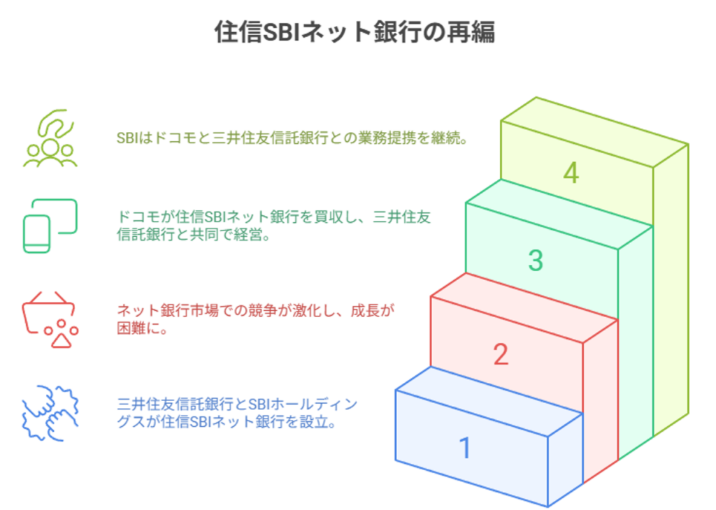 住信SBIネット銀行がSBIから離れた理由は、「SBIが手放した」のではなく、ドコモが買収し、三井住友信託銀行とドコモが共同で経営する形に再編されたためです。