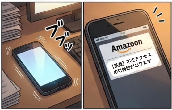「不正アクセスの可能性があります」と言われたら、そのリンクを押さずに、自分でブラウザを開いてAmazoonやGmailに直接ログインする。本当に問題があれば、ログイン後の画面で通知が出るはずだ。