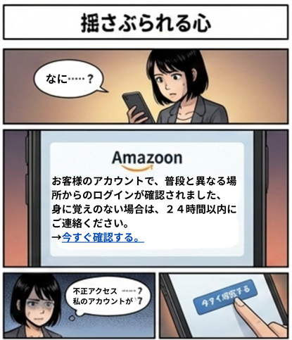 不安——「不正アクセス」「利用停止」「異常を検知」。怖いと思うと、冷静な判断が飛ぶ。