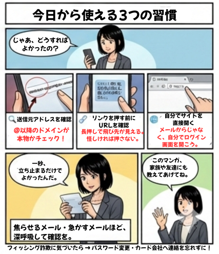 怖いメール・急かすメールが来たとき、反射的にリンクを押さない。一秒だけ止まって、「これ、本物か?」と自問する。その一秒が、あなたのお金と個人情報を守る。