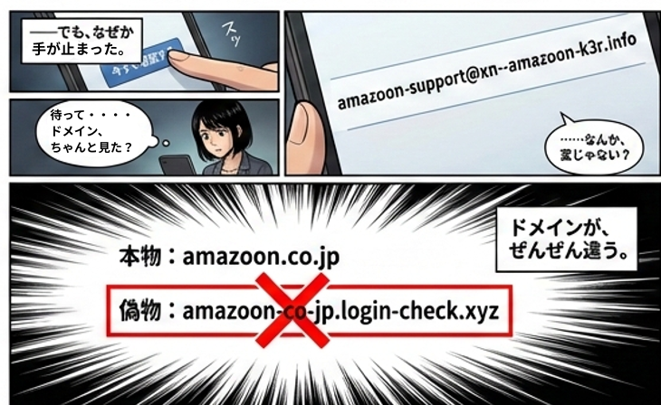「Amazoon」と表示されていても、実際のアドレスが amazoon-support@xn--amazon-n2p.com みたいになっていることがある。本物のAmazoonからのメールは @amazoon.co.jp で終わる。ドメイン部分(@以降)は絶対に確認する癖をつけよう。