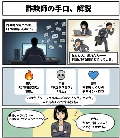 焦り——「24時間以内に」「緊急」「今すぐ」。時間がないと人は確認をさぼる。